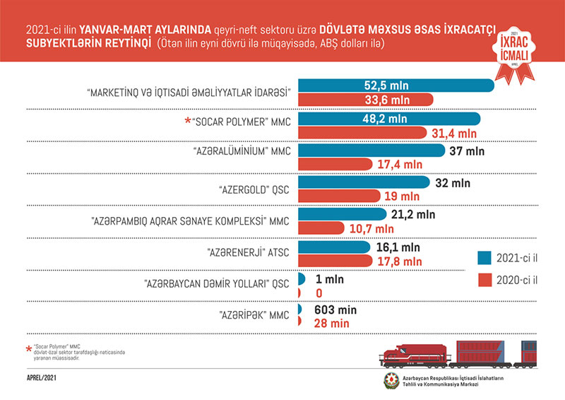 Qeyri-neft sektoru üzrə ixrac əməliyyatlarında iştirak edən dövlətə məxsus olan və 150 min ABŞ dollarından artıq ixrac həyata keçirən şirkətlərin siyahısına isə Azərbaycan Respublikası Dövlət Neft Şirkətinin “Marketinq və İqtisadi Əməliyyatlar İdarəsi” başçılıq edir. Daha sonra bu siyahıda aşağıdakı şirkətlər təmsil olunurlar: