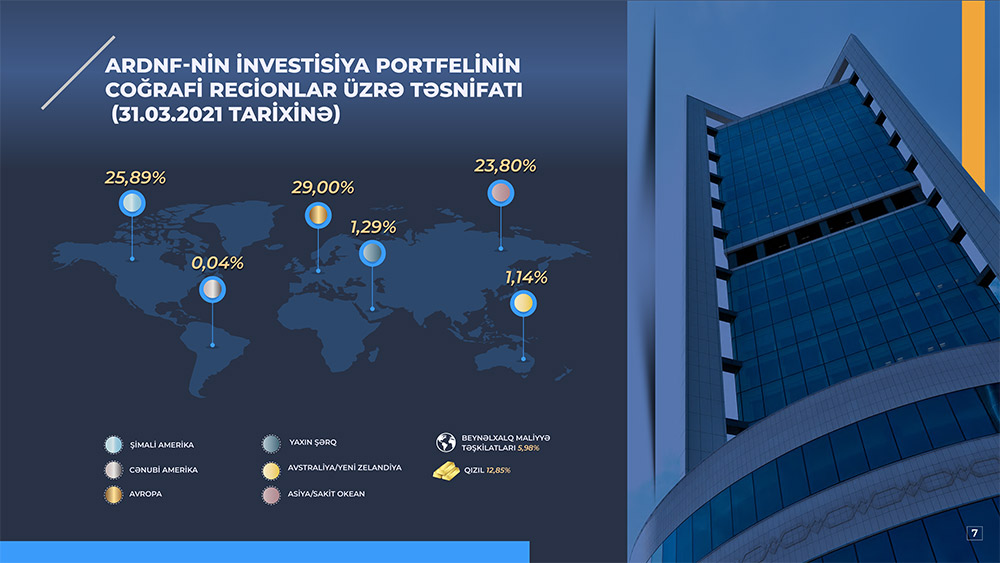 Cari ilin yanvar-mart ayları ərzində ARDNF-nin 2021-ci il büdcəsinin icrası çərçivəsində 2 milyard 513,7 milyon manat vəsait dövlət büdcəsinə transfert edilmişdir, “2019-2023-cü illər üçün Azərbaycan Respublikasında ali təhsil sisteminin beynəlxalq rəqabətliliyinin artırılması üzrə Dövlət Proqramı”nın maliyyələşdirilməsinə 0,7 milyon manat vəsait yönəldilmişdir. 2021-ci ilin ilk rübü ərzində ARDNF-nin idarə edilməsi ilə bağlı xərcləri 5,5 milyon manat təşkil etmişdir.