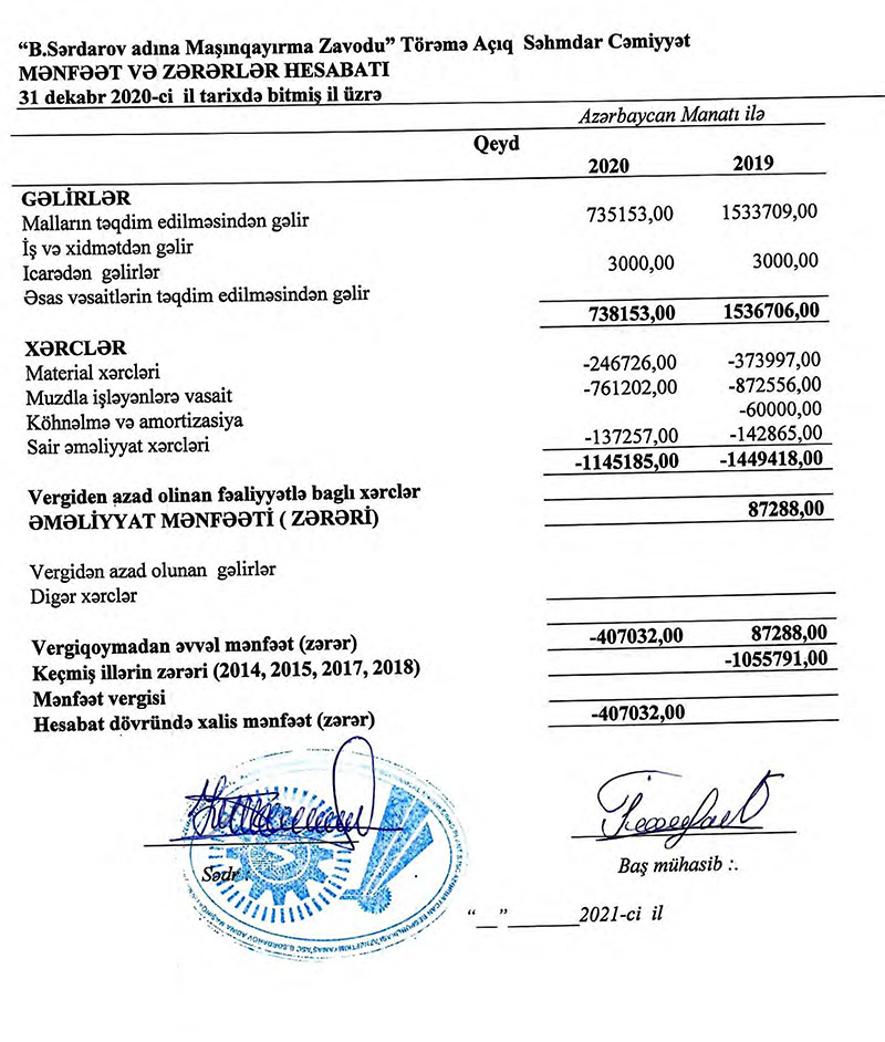 "B.Sərdarov adına Maşınqayırma Zavodu" TASC 2020-ci ili 407 min manat xalis zərər ilə başa vurub. Müəssisə 2019-cu ili 87 min 300 manat xalis mənfəət ilə bağlamışdı.