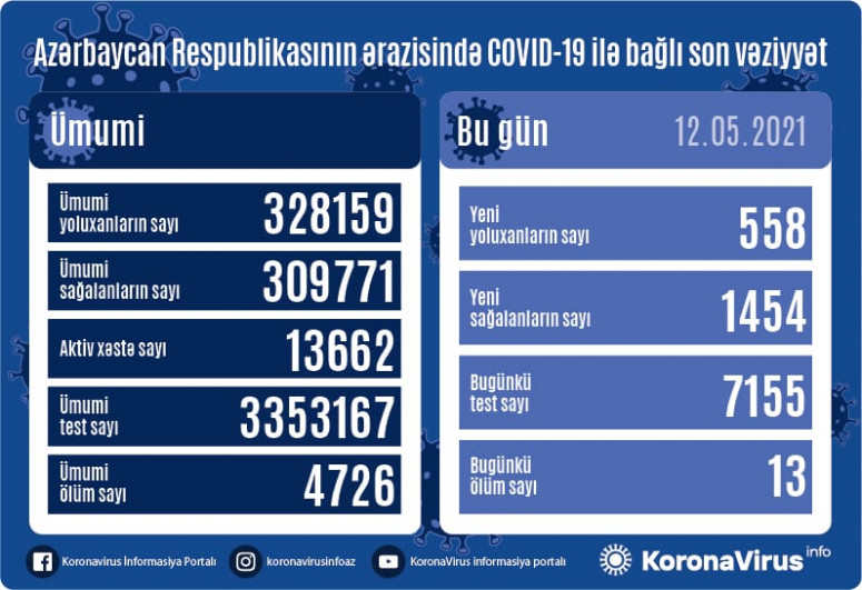 Azərbaycan Respublikasında koronavirus (COVID-19) infeksiyasına 558 yeni yoluxma faktı qeydə alınıb,1454 nəfər müalicə olunaraq sağalıb.