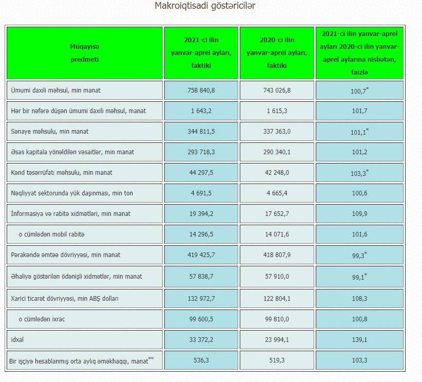 Bu ilin yanvar-aprel aylarında Naxçıvan Muxtar Respublikasında ÜDM-in həcmi 2020-ci ilin eyni dövrünə nisbətən (müqayisəli qiymətlər üzrə) 0,7% artaraq 758 milyon 840 min manat təşkil edib.