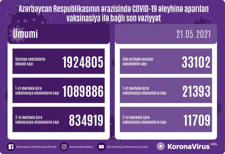 Ölkədə vurulan vaksinlərin ümumi sayı 1 924 805, birinci mərhələ üzrə vaksinasiya olunanların ümumi sayı 1 089 886, ikinci mərhələ üzrə vaksinasiya olunanların sayı isə 834 919 təşkil edir.