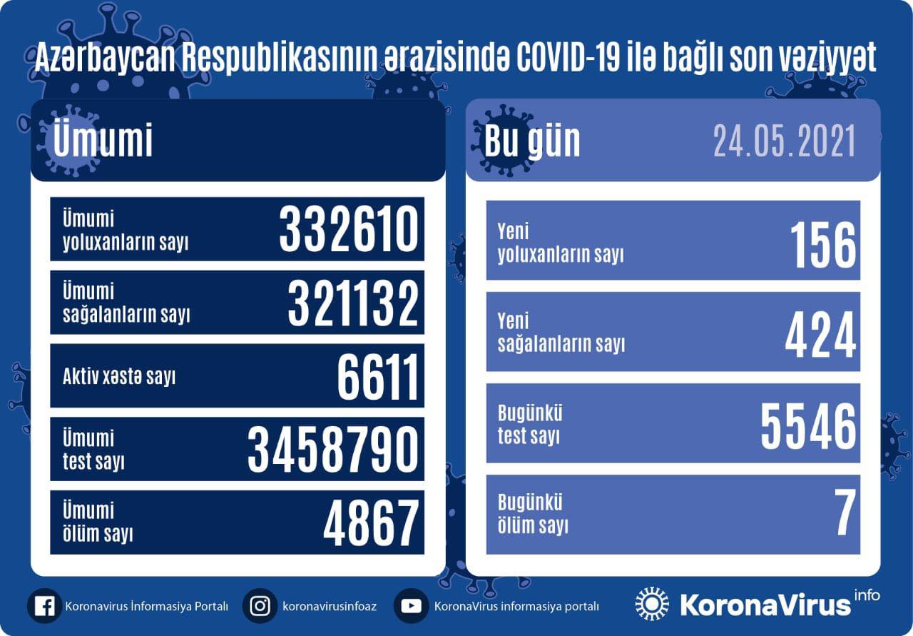 Azərbaycanda bu gün koronavirus infeksiyasına 156 yeni yoluxma faktı qeydə alınıb, 424 nəfər müalicə olunaraq sağalıb və evə buraxılıb.