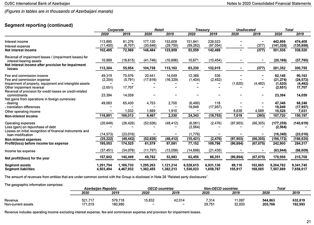“Azərbaycan Beynəlxalq Bankı” ASC 31 dekabr 2020-ci il tarixinə olan konsolidə edilmiş maliyyə hesabatını açıqlayıb. Konsolidə edilmiş maliyyə göstəriciləri “Azərbaycan Beynəlxalq Bankı”nın maliyyə nəticələri ilə bərabər, törəmə şirkətlərinin - "ABB-Moskva" bankının, "ABB-GEO" QSC , "Azericard" MMC-nin, "Beynəlxalq Lizinq Şirkəti" MMC-nin və "ABB-İnvest İnvestisiya Şirkəti" QSC-nin maliyyə göstəricilərini də əks etdirir (birlikdə qrup). Beynəlxalq Maliyyə Hesabatı Standartlarına uyğun hazırlanmış konsolidə edilmiş maliyyə hesabatlarına müstəqil auditor şirkəti olan “Ernst & Young” (EY) şirkəti müsbət rəy verib.