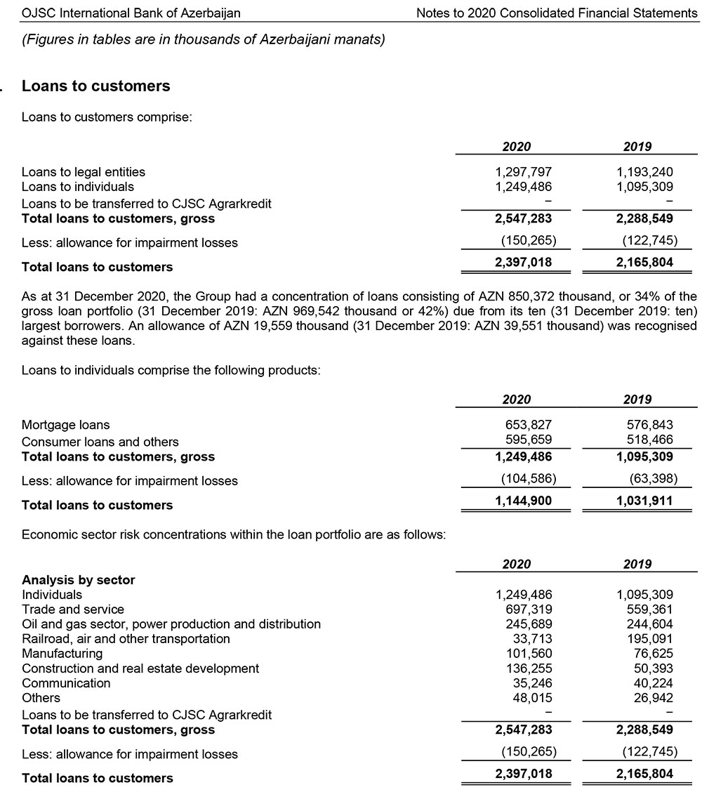 Fərdi müştərilərə verilmiş 1 milyard 249 milyon 486 min manat kreditin 653 milyon 827 min manatını ipoteka kreditləri təşkil edib. 2020-ci ildə Bankın ipoteka kreditləri portfeli 76 milyon 984 min manat artıb.
