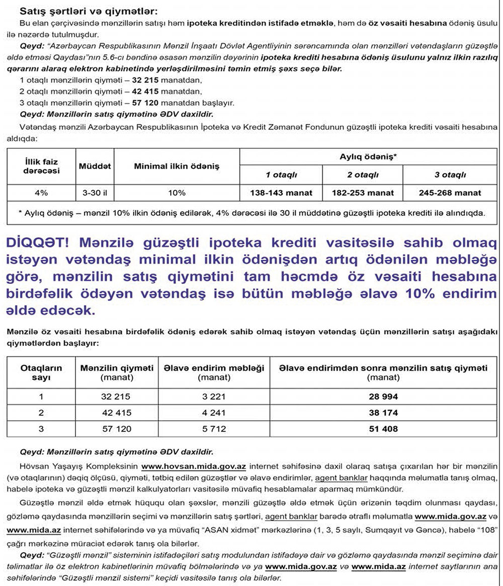 Vətəndaş mənzili Azərbaycan Respublikasının İpoteka və Kredit Zəmanət Fondunun güzəştli ipoteka krediti vəsaiti hesabına aldıqda 1 otaqlı üçün aylıq ödəniş 138-143 manat, 2 otaqlı üçün 182-253 manat, 3 otaqlı üçün 245-268 manat təşkil edir. İlkin ödəniş minimal 10%-dir.