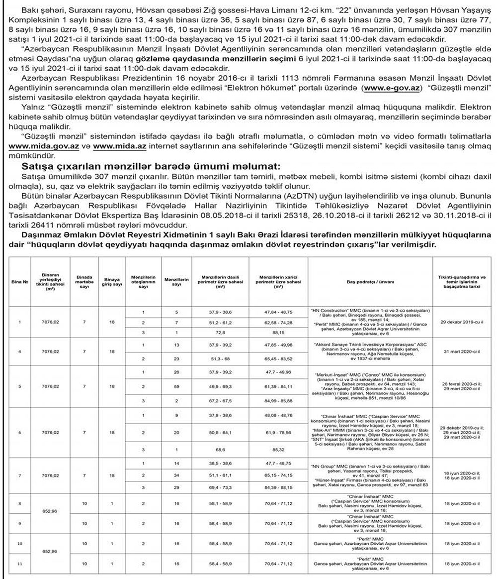 Bakı şəhəri, Suraxanı rayonu, Hövsan qəsəbəsi Zığ şossesi-Hava Limanı 12-ci km. “22” ünvanında yerləşən Hövsan Yaşayış Kompleksinin 1 saylı binası üzrə 13, 4 saylı binası üzrə 36, 5 saylı binası üzrə 87, 6 saylı binası üzrə 30, 7 saylı binası üzrə 77, 8 saylı binası üzrə 16, 9 saylı binası üzrə 16, 10 saylı binası üzrə 16 və 11 saylı binası üzrə 16 mənzilin, ümumilikdə 307 mənzilin satışı 1 iyul 2021-ci il tarixində saat 11:00-da başlayacaq və 15 iyul 2021-ci il tarixi saat 11:00-dək davam edəcəkdir.
