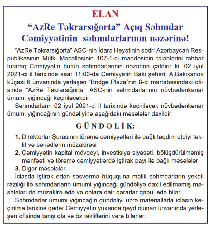 İyulun 2-də, saat 11:00-da “AzRe Təkrarsığorta” ASC-nin səhmdarlarının növbədənkənar ümumi yığıncağı keçiriləcək.