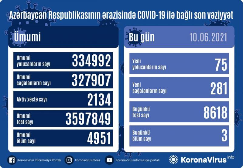 Azərbaycanda koronavirus (COVID-19) infeksiyasına 75 yeni yoluxma faktı qeydə alınıb, 281 nəfər müalicə olunaraq sağalıb.
