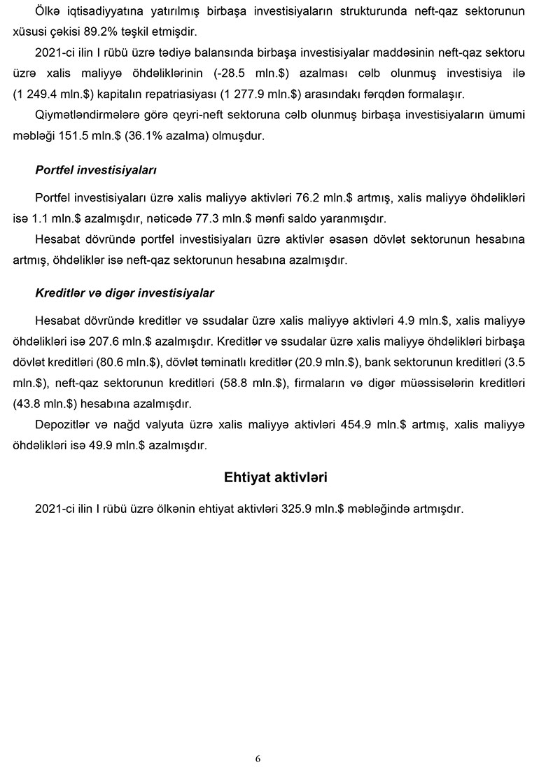 Bu ilin I rübündə Azərbaycanın tədiyyə balansının ümumi qalığı 325,9 milyon ABŞ dolları təşkil edib. Halbuki ötən ilin eyni dövründə tədiyyə balasında 1 milyard 343,5 milyon dollarlıq kəsir yaranmışdı.