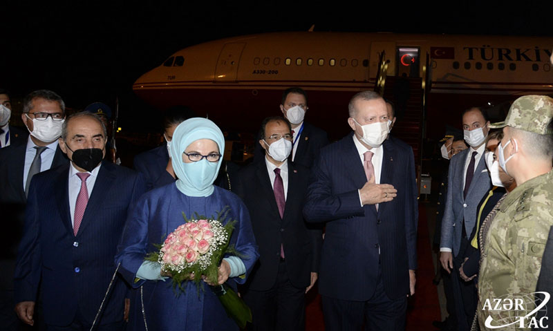 Türkiyə Prezidenti Rəcəb Tayyib Ərdoğanı və xanımı Əminə Ərdoğanı hava limanında Azərbaycan Respublikası Baş nazirinin birinci müavini Yaqub Eyyubov, xarici işlər nazirinin müavini Xələf Xələfov və digər rəsmi şəxslər qarşıladılar.