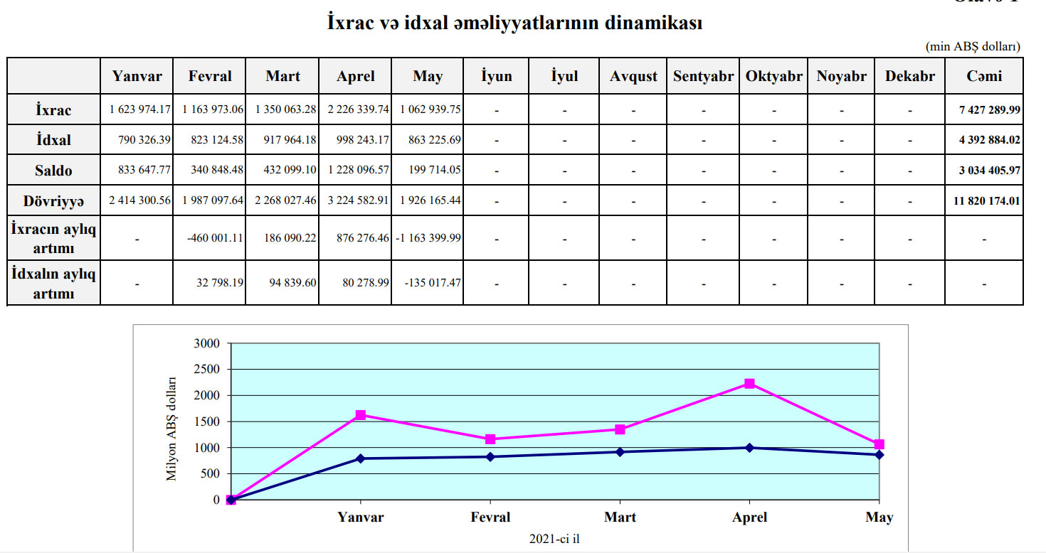 2021-ci ilin May ayında Azərbaycanın ixracı 1 milyard 62 milyon 939 min dollar, idxalı 863 milyon 225 min dollar, saldo 199 milyon 714 min dollar təşkil edib. Apreldə ixrac 2 milyard 226 milyon 339 min dollar, idxal 998 milyon 243 min dollar, saldo 1milyard 228 milyon 96 min dollar təşkil etmişdi.