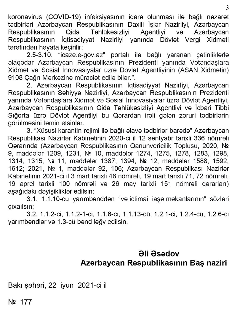 - Nazirlər Kabinetinin 2021-ci il 26 may tarixli 151 nömrəli Qərarına əsasən 2021-ci il iyulun 1-dən etibarən COVİD-19 pasport tələbi tətbiq olunan məkanlarda çalışan işçi heyətin (müvəqqəti işə cəlb edilmiş işçilər daxil olmaqla) azı 80 faizinin COVID-19 pasportuna malik olması mütləqdir (1 avqustadək birinci doza qeyd olunmuş vaksinasiya sertifikatı qəbul eilir). Şənlik mərasimində xidmət göstərən heyətin (musiqiçilər istisna olmaqla) tibbi maskalardan, əlcəklərdən və digər fərdi qoruyucu vasitələrdən istifadəsi məcburidir.