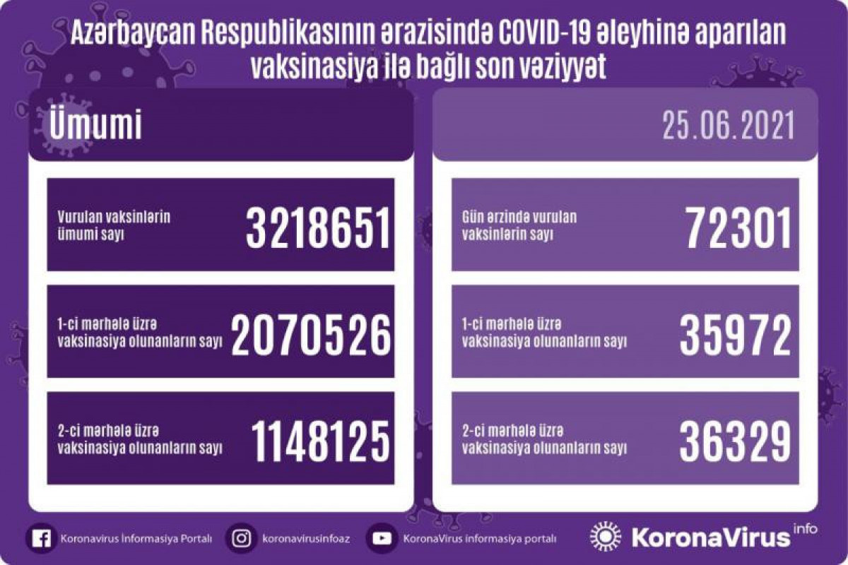 Ölkədə vurulan vaksinlərin ümumi sayı 3 218 651, birinci mərhələ üzrə vaksinasiya olunanların ümumi sayı 2 070 526, ikinci mərhələ üzrə vaksinasiya olunanların sayı isə 1 148 125 təşkil edir.