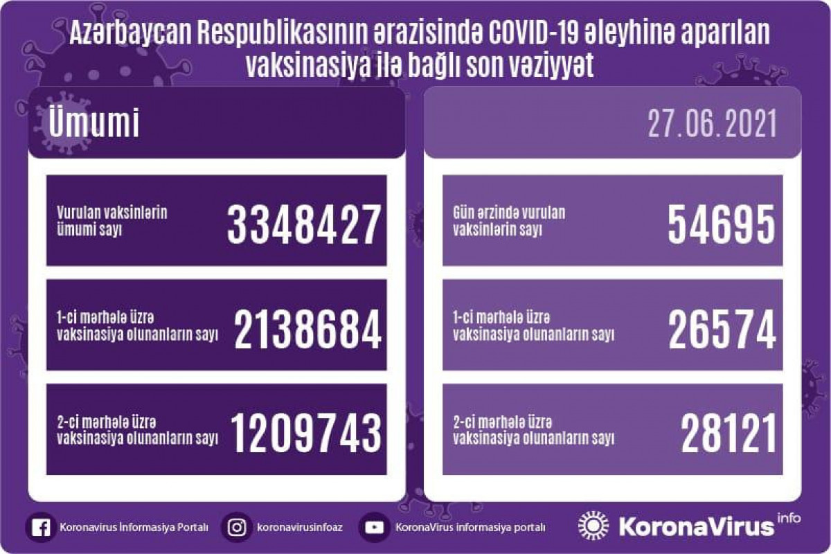 Azərbaycanda son sutkada koronavirus (COVID-19) əleyhinə 54 695 vaksin vurulub.