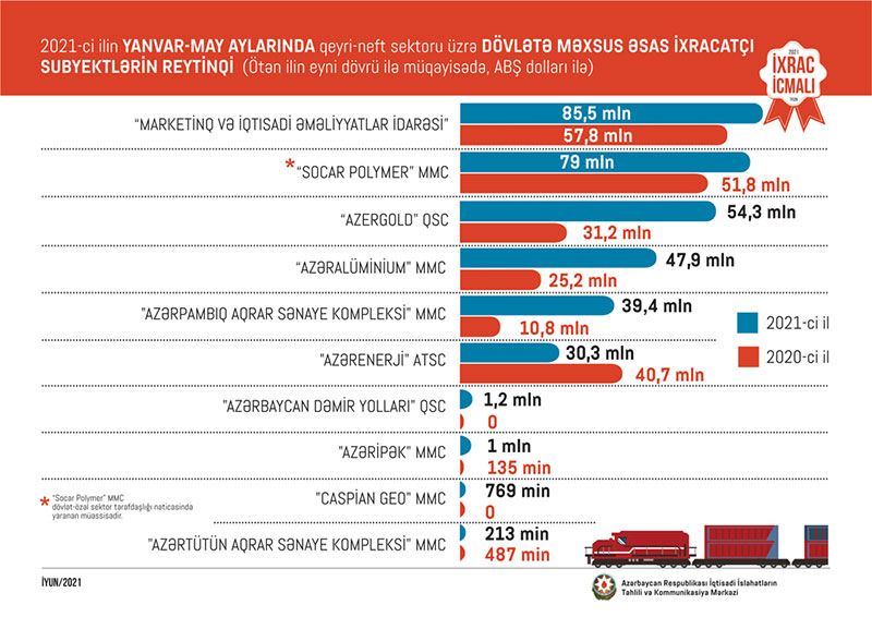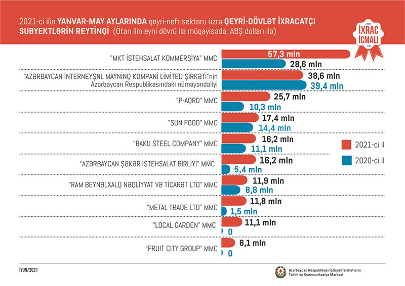Marja xəbər verir ki, 2021-ci ilin ilk 5 ayında "MKT İstehsalat Kommersiya" tərəfindən 57,3 milyon dollarlıq məhsul ixrac edilib. "MKT"nin ixracı ötən ilin eyni dövrü ilə müqayisədə 2 dəfə artıb. Şirkət 2020-ci ilin ilk 5 ayında 28,6 milyon dollarlıq məhsul ixrac etmişdi.