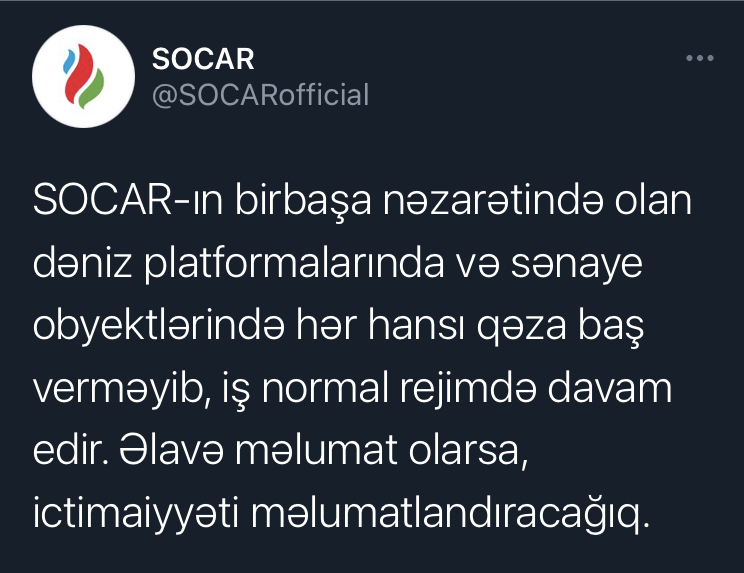"SOCAR-ın birbaşa nəzarətində olan dəniz platformalarında və sənaye obyektlərində hər hansı qəza baş verməyib, iş normal rejimdə davam edir".