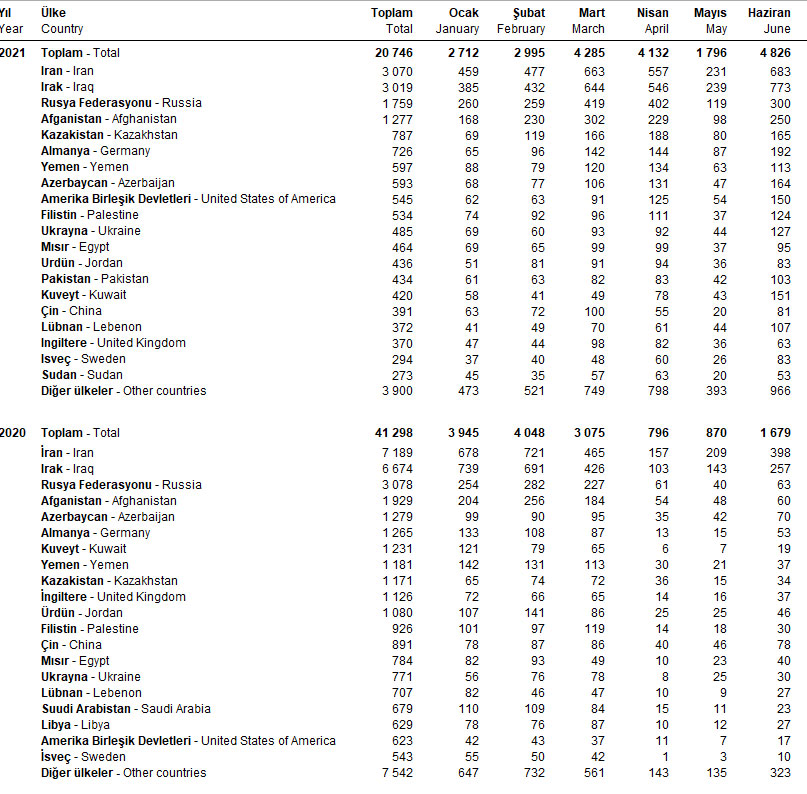 2021-ci ilin yanvar-iyun aylarında azərbaycanlılar Türkiyədə 593 mənzil alıblar. 2020-cu ilin eyni dövründə azərbaycanlılar Türkiyədə 431 mənzil almışdılar.