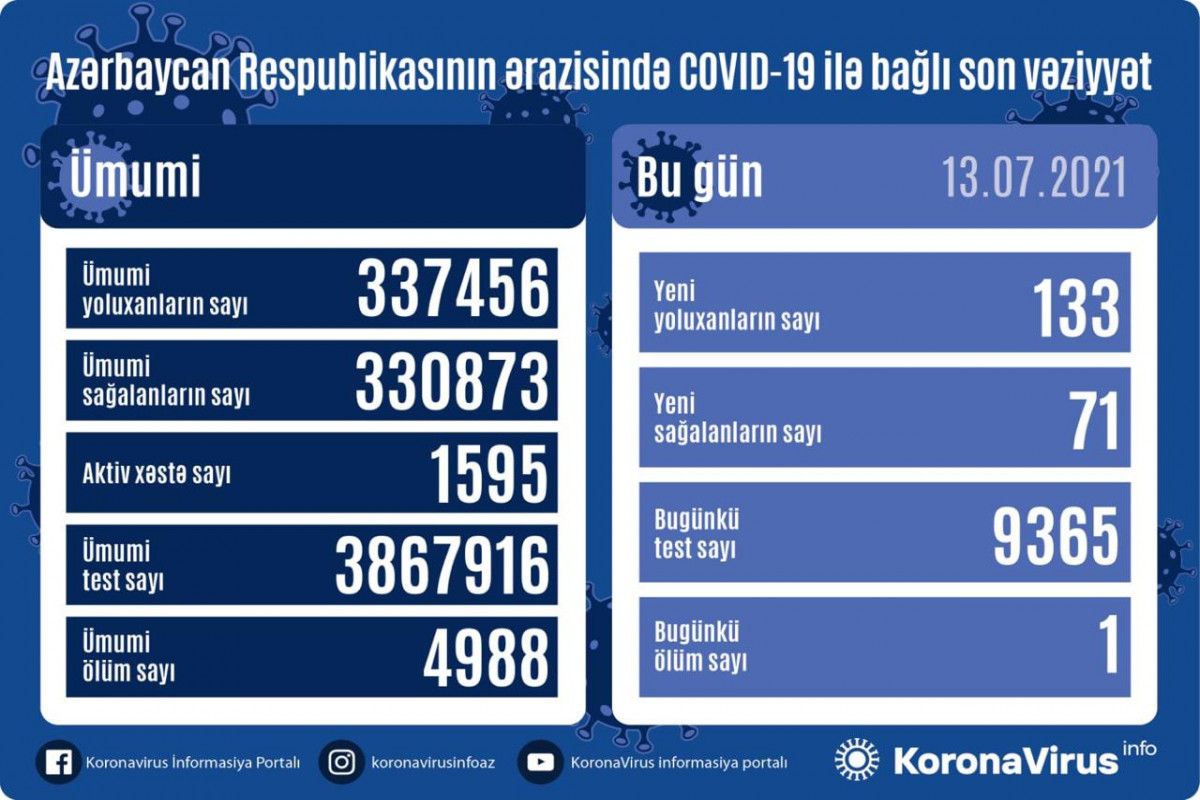 Azərbaycan Respublikasında koronavirus (COVID-19) infeksiyasına 133 yeni yoluxma faktı qeydə alınıb, 71 nəfər müalicə olunaraq sağalıb.