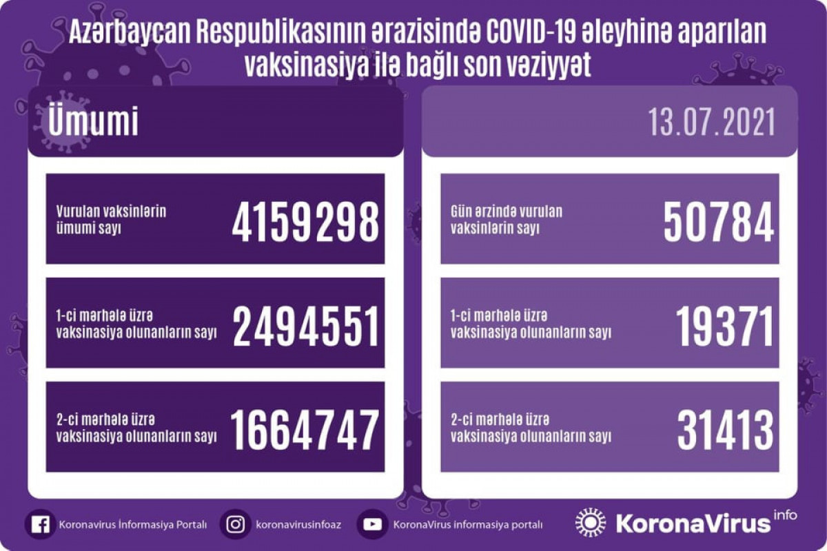 Ölkədə vurulan vaksinlərin ümumi sayı 4 159 298, birinci mərhələ üzrə vaksinasiya olunanların ümumi sayı 2 494 551, ikinci mərhələ üzrə vaksinasiya olunanların sayı isə 1 664 747 təşkil edir.