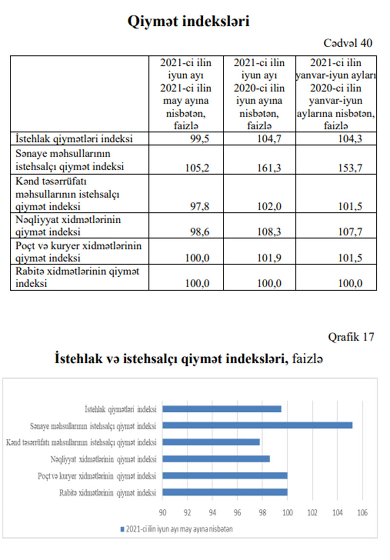2021-ci ilin iyun ayında istehlak qiymətləri indeksi may ayı ilə müqayisədə isə 0,5 faiz azalıb (deflyasiya baş verib. Deflyasiya - mal və xidmətlərin qiymətlərinin ümumi səviyyəsinin geriləməsidir).