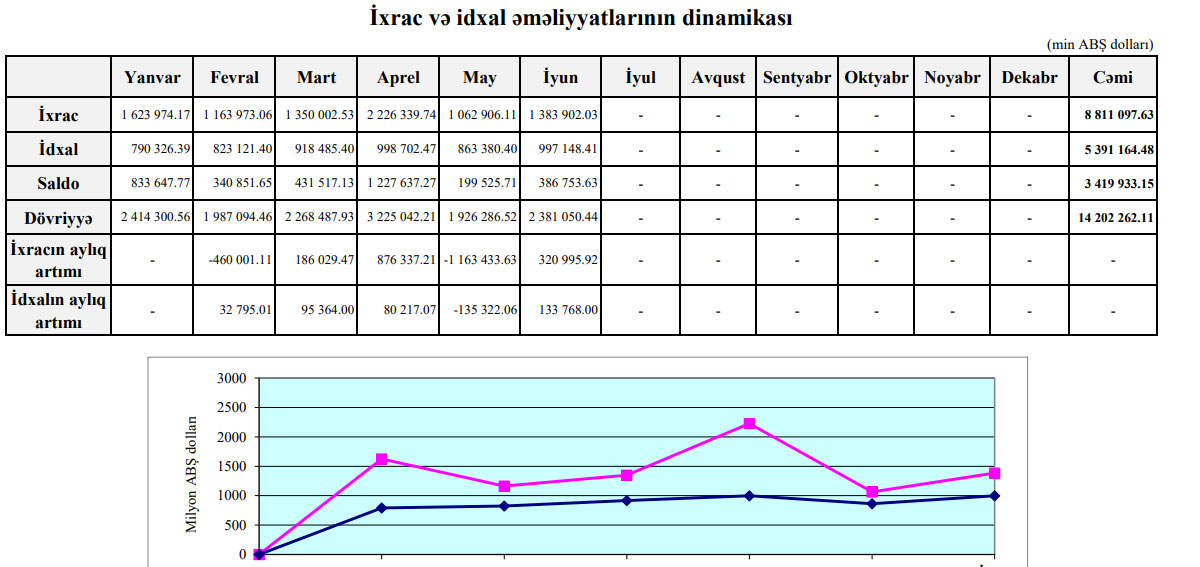 2021-ci ilin yanvar-iyun dövründə (ilk 6 ayda) Azərbaycanın xarici ticarət əməliyyatlarının həcmi 14 milyard 202 milyon 262 min ABŞ dolları təşkil edib.