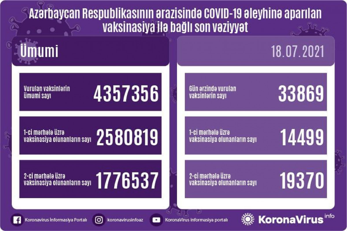 Ölkədə vurulan vaksinlərin ümumi sayı 4 357 356, birinci mərhələ üzrə vaksinasiya olunanların ümumi sayı 2 580 819, ikinci mərhələ üzrə vaksinasiya olunanların sayı isə 1 776 537 təşkil edir.