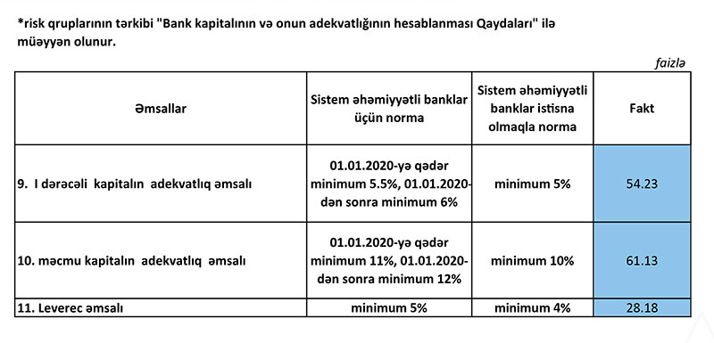 Bankın Məcmu kapitalının və I dərəcəli kapitalının adekvatlıq əmsalı Mərkəzi Bankın normalarından dəfələrlə artıqdır. Belə ki, Bankda Məcmu kapitalın adektvatlıq əmsalı 61% təşkil edib (Mərkəzi Bankın norması 10%), I dərəcəli kapitalın norması isə 54%-dən çoxdur (norma 5%).