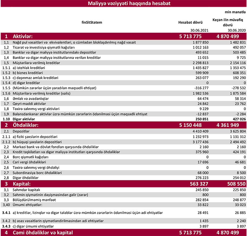 2021-ci ilin yanvar - iyun dövründə Kapital Bankın cəmi əməliyyat gəlirləri (faiz və qeyri-faiz gəlirləri) 363 milyon 774 min manat, cəmi əməliyyat xərcləri (faiz və qeyri-faiz xərcləri) 183 milyon 456 min manat, gəlirlər xərcləri üstələdiyindən əməliyyat mənfəəti 180 milyon 318 min manat təşkil edib. Bank əməliyyat mənfəətindən 53 milyon 523 min manat mümkün zərərlər üçün yaradılan məqsədli ehtiyatlara ayırıb və 27 milyon 23 min manat mənfəət vergisi ödəyib. Beləliklə, “Kapital Bank” 2021-ci ilin 1-ci yarısını 99 milyon 772 min manat xalis mənfəət ilə başa vurub.