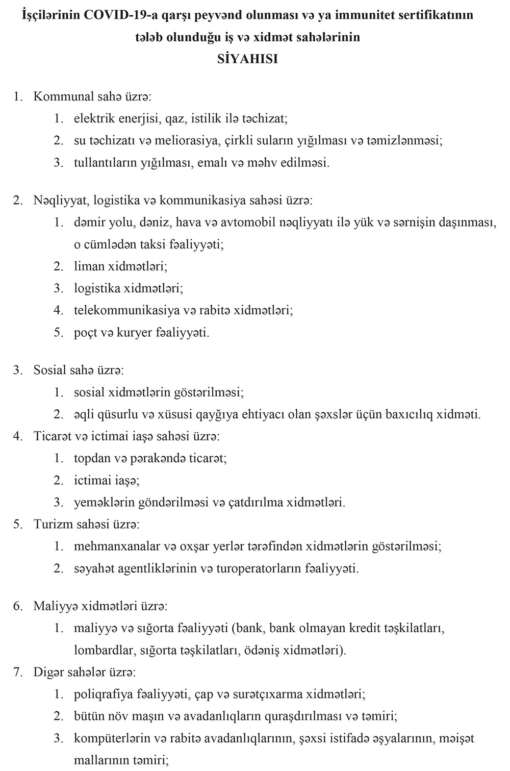 2021-ci il 1 sentyabr tarixindən etibarən dövlət orqanlarının (qurumlarının) əməkdaşlarının, habelə aşağıda qeyd olunan müəssisələrin işçilərinin (əmək və ya mülki müqavilələrlə işləməsindən asılı olmayaraq) azı 80 faizinin COVID-19-a qarşı birinci doza, 1 oktyabr tarixindən etibarən isə ikinci doza peyvənd olunması və ya COVID-19-a qarşı immunitet sertifikatının olması tələb edilir: