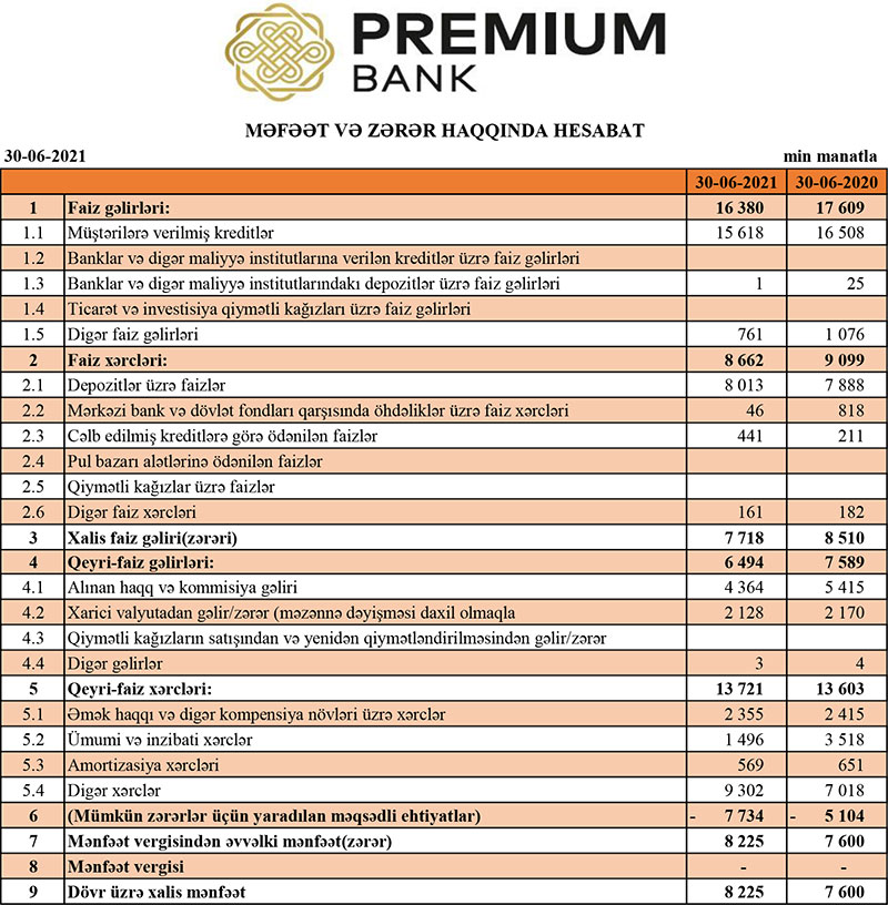 "Premium Bank” ASC 2021-ci ilin 1-ci yarısını (yanvar-iyun dövrünü) 8 milyon 225 min manat xalis mənfəət ilə başa vurub. Bu, ötən ilin eyni dövrü ilə müqayisədə 8,2% çoxdur. Belə ki, "Premium Bank” 2020-ci ilin 1-ci yarısını 7 milyon 600 min manat xalis mənfəət ilə bağlamışdı. Xalis mənfəətin böyük hissəsi ehtiyatdan azad olmuş vəsaitin hesabınadır. Bankın əməliyyat mənfəəti kəskin azalıb.
