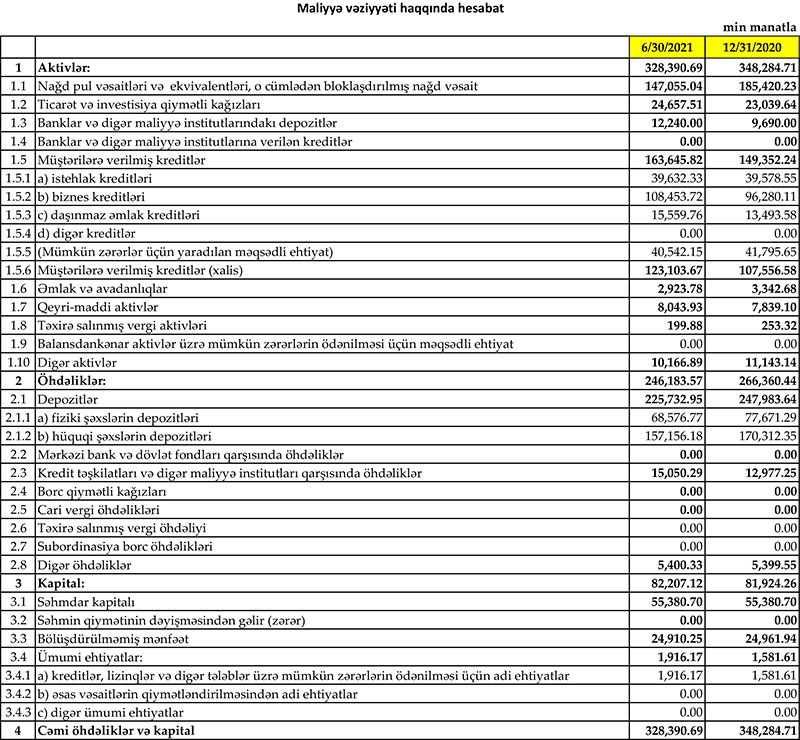 2021-ci ilin ikinci rübünün nəticələrinə görə hazırda bankın məcmu kapitalı 74 milyon manat təşkil edir və mövcud qanunvericiliyə əsasən minimum məcmu kapital norması 50 milyon manatdır.