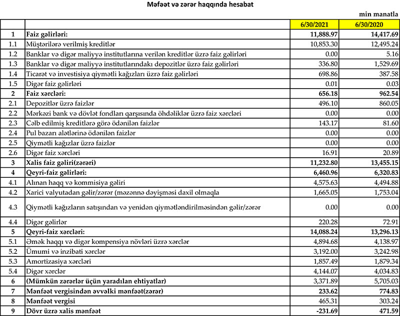 Müqayisə üçün qeyd edək ki, 2020-ci ilin yanvar-iyun dövründə "Yapı Kredi Bank Azərbaycan"ın cəmi əməliyyat gəlirləri 20 milyon 739 min manat, cəmi əməliyyat xərcləri 14 milyon 259 min manat, əməliyyat mənfəəti 6 milyon 480 min manat təşkil etmişdi. Bank əməliyyat mənfəətindən ehtiyata 5 milyon 705 min manat ayırdığından və 303 min manat mənfəət vergisi ödədiyindən həmin dövrü 472 min manat xalis mənfəət ilə bağlamışdı.