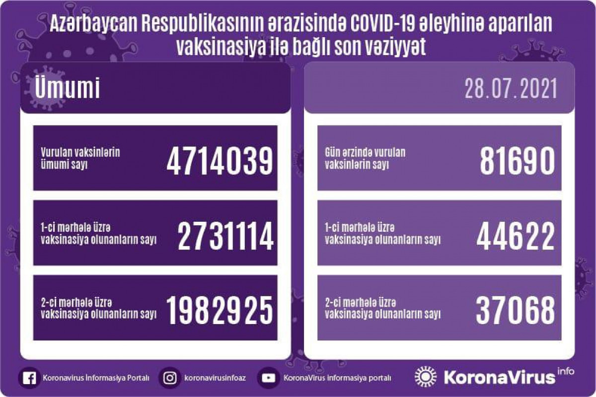 Ölkədə vurulan vaksinlərin ümumi sayı 4714039, birinci mərhələ üzrə vaksinasiya olunanların ümumi sayı 2731114, ikinci mərhələ üzrə vaksinasiya olunanların sayı isə 1982925 təşkil edir.
