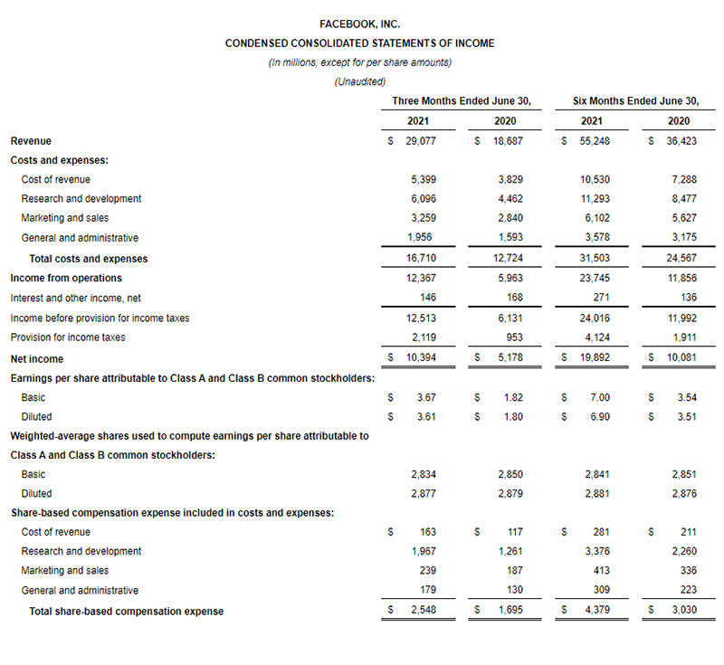 Rüb ərzində Facebook-un mülkiyyətində olan tətbiqi proqram və şəbəkələrdə (Facebook, Instagram, Messencer və Whatsapp) aylıq aktiv istifadəçi sayı 3,51 milyard nəfər təşkil edib. Bunun əsas hissəsi - 2,9 milyard istifadəçi Facebook sosial şəbəkəsinin payına düşüb. Onun tətbiqi proqramlarını işlədən hər istifadəçiyə görə Facebook-un qazancı ortalama 10,12 dollar olub.