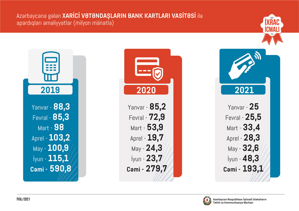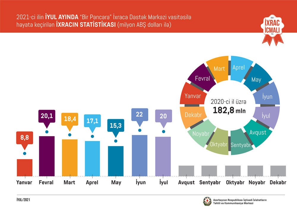 Marja İcmala istinadən xəbər verir ki, ilin ilk 6 ayı ərzində Azərbaycanın ixracının dəyəri 8.8 milyard ABŞ dolları, qeyri-neft sektoru üzrə 1,2 milyard dollar təşkil edib. Qeyri-neft sektoru üzrə ixrac 2020-ci ilin müvafiq dövrü ilə müqayisədə 248 milyon dollar və ya 27.1 faiz artıb.