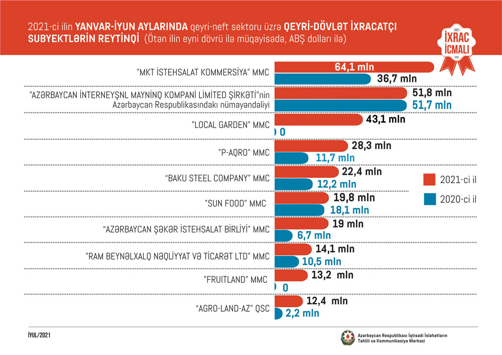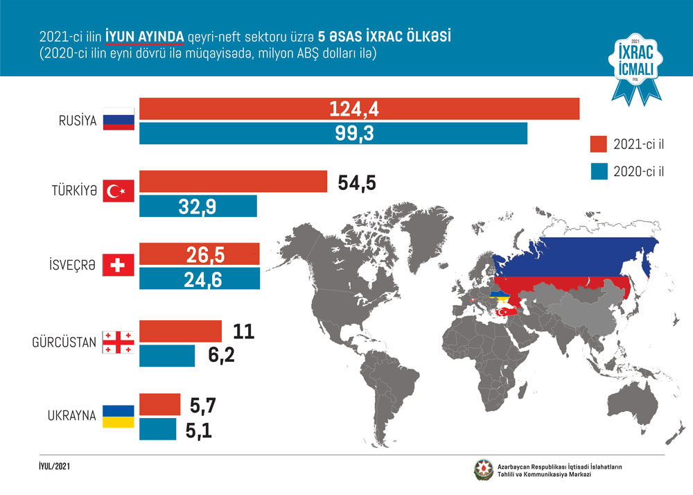 2021-cu ilin iyun ayında qeyri-neft sektoruna aid ən çox mal ixrac edilən ölkələrin siyahısında Rusiya (124.4 milyon ABŞ dolları) birinciliyə yüksəlib. Bu siyahıda Türkiyə ikinci (54.5 milyon ABŞ dolları) və İsveçrə üçüncü (26.5 milyon ABŞ dolları) olub.