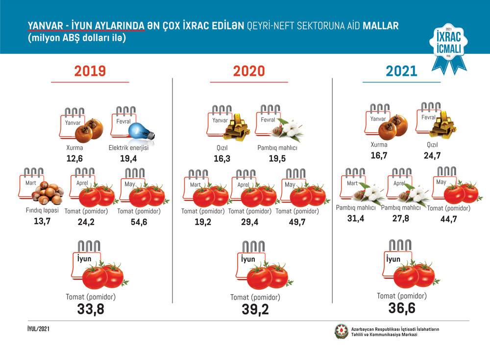 2021-ci ilin yanvar-iyun ayları ərzində ixrac edilən qeyri-neft sektoruna aid malların siyahısında tomat (pomidor) (123.6 milyon ABŞ dolları) birinci olub. Bu siyahıda pambıq mahlıcı ikinci (121.9 milyon ABŞ dolları), qızıl isə üçüncü (107.9 milyon ABŞ dolları) yerdə qərarlaşıb.