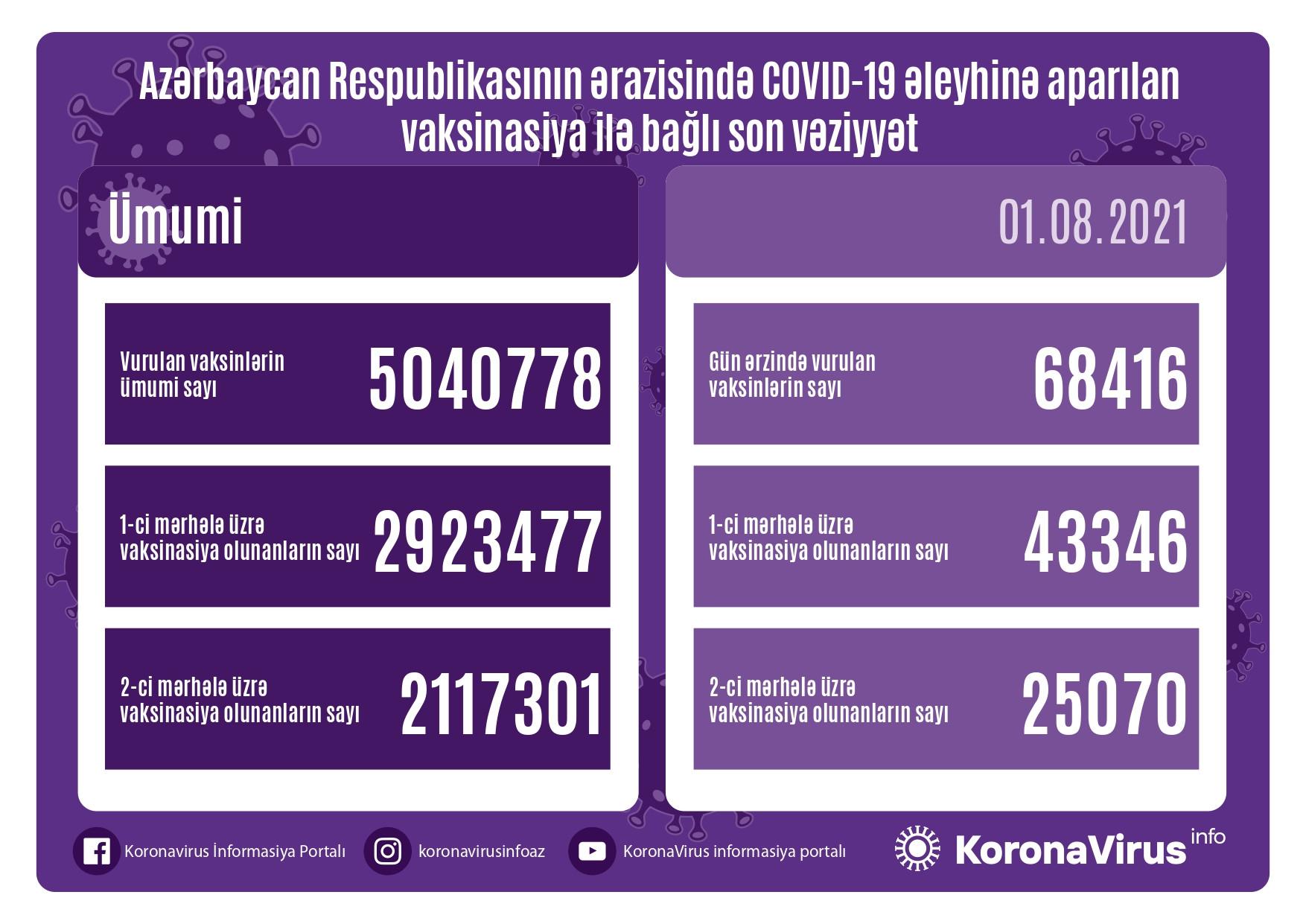 Azərbaycanda son sutkada koronavirus (COVID-19) əleyhinə 68 416 vaksin vurulub.