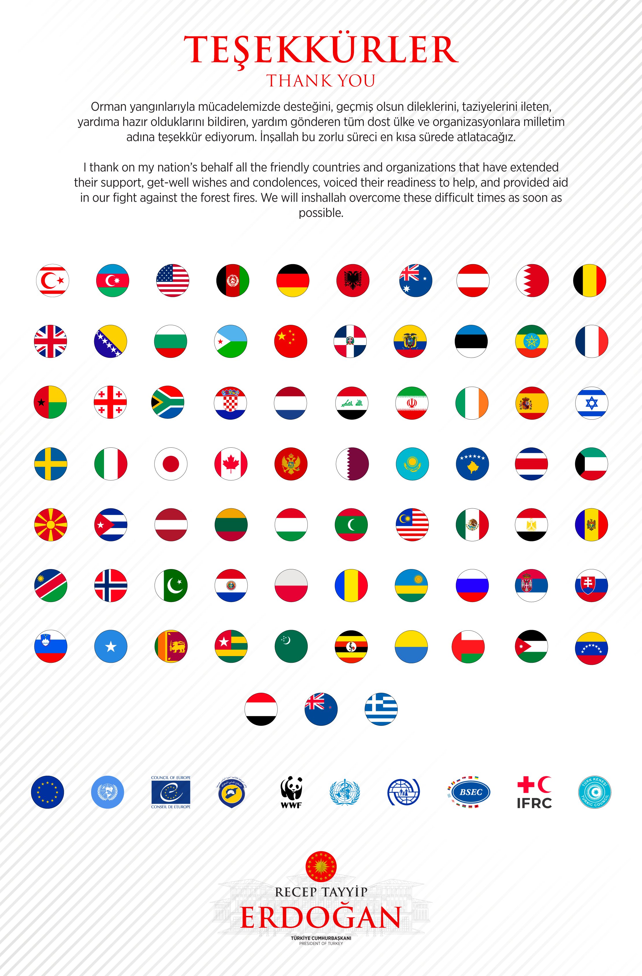 Meşə yanğınları ilə mübarizəmizdə dəstəyini, keçmiş olsun diləklərini, başsağlığılarını çatdıran, köməyə hazır olduqlarını bildirən, kömək göndərən bütün dost ölkə və təşkilatlara millətim adından təşəkkür edirəm.