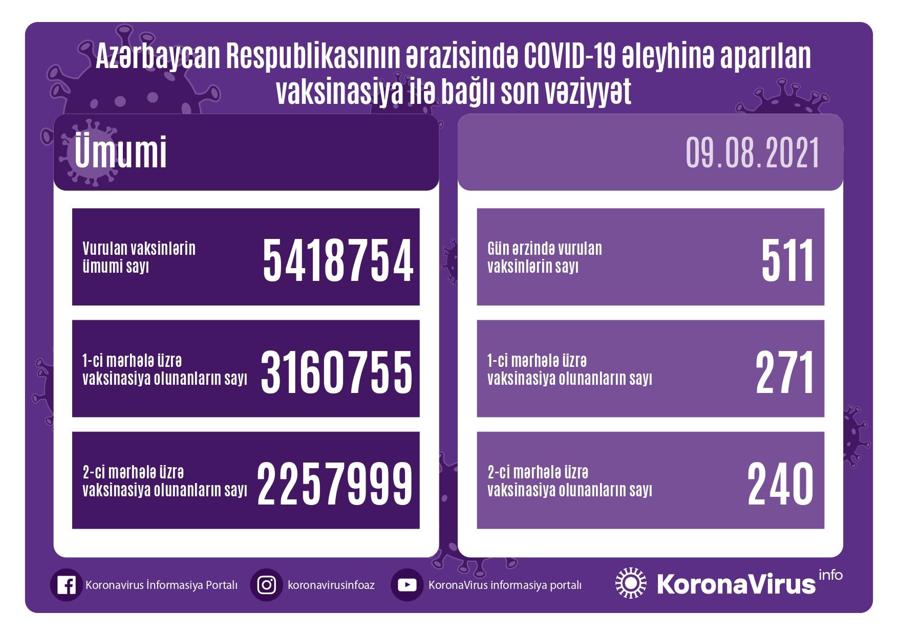 Azərbaycanda bu günə qədər vurulan vaksinlərin ümumi sayı 5 418 754, birinci mərhələ üzrə peyvənd olunanların ümumi sayı 3 160 755, ikinci mərhələ üzrə vaksinasiya edilənlərin sayı 2 257 999 nəfər təşkil edir.