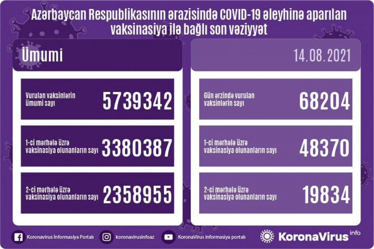 Azərbaycanda son sutkada koronavirus (COVID-19) əleyhinə 68 204 vaksin vurulub.