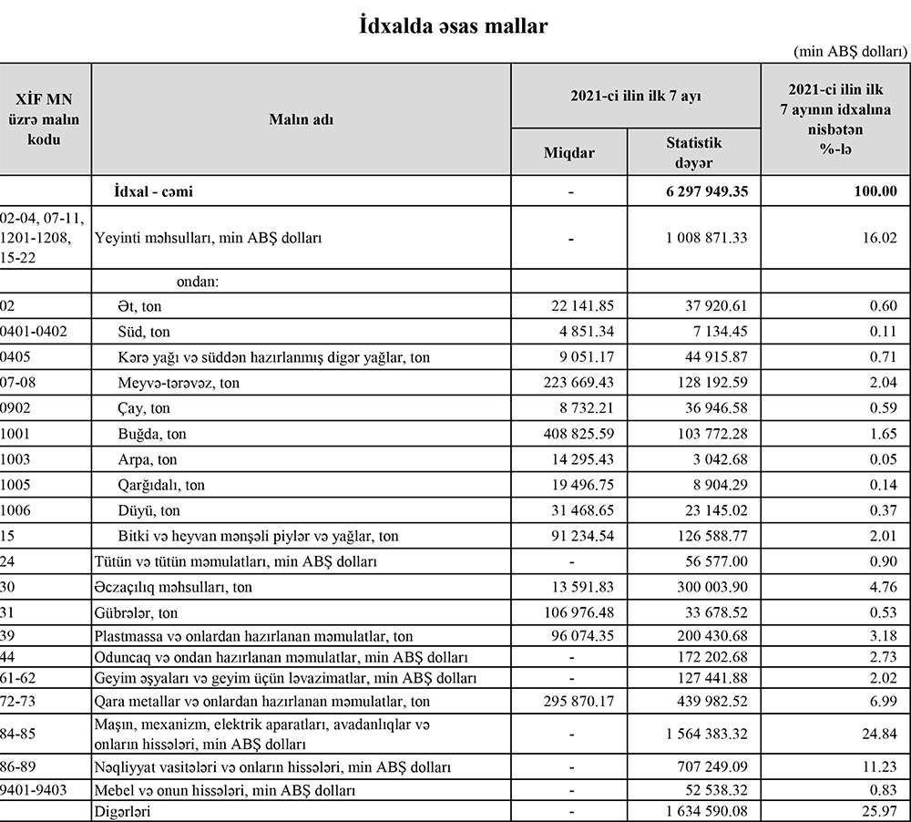 2021-ci ilin yanvar-iyul aylarında Azərbaycanın ən çox ixrac və idxal etdiyi mallar açıqlanıb.