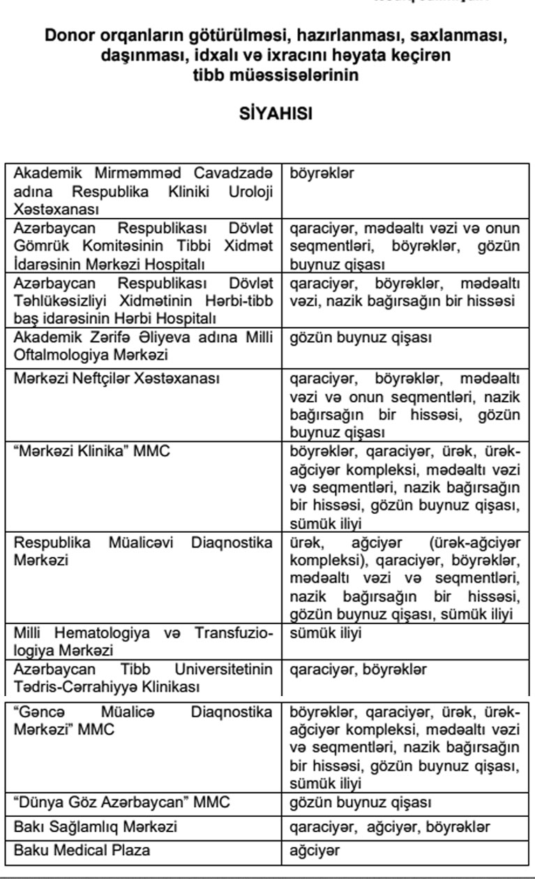 Donor orqanların götürülməsi, hazırlanması, saxlanması, daşınması, idxalı və ixracını həyata keçirən tibb müəssisələrinin siyahısı aşağıdakı kimidir: