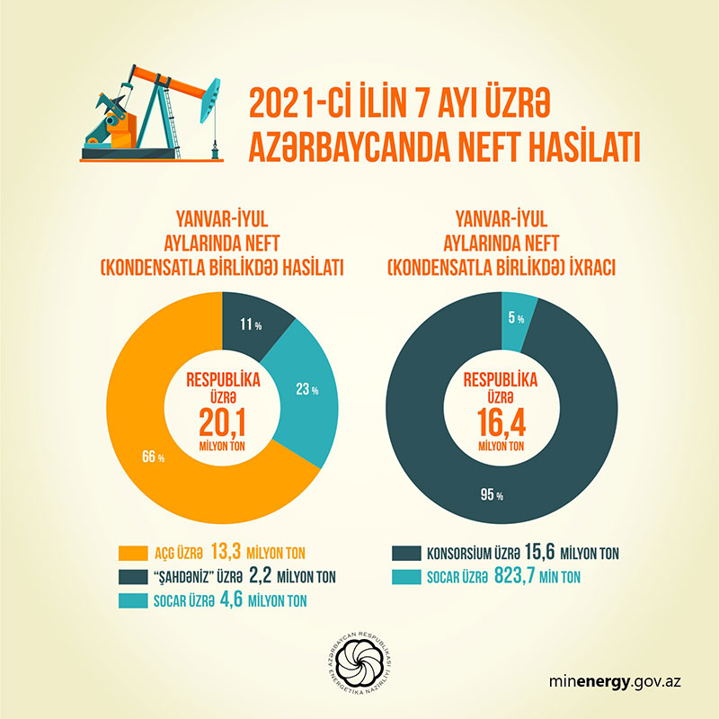 Energetika Nazirliyinin yaydığı məlumata görə, 2021-ci ilin yanvar-iyul ayları üzrə operativ məlumatlara əsasən, Azərbaycanda təxminən 20,1 milyon ton neft (kondensatla birlikdə) hasil edilib. Neft (kondensatla birlikdə) hasilatı ötən ilin müvafiq dövrü ilə müqayisədə təxminən, 522,2 min ton az olub.