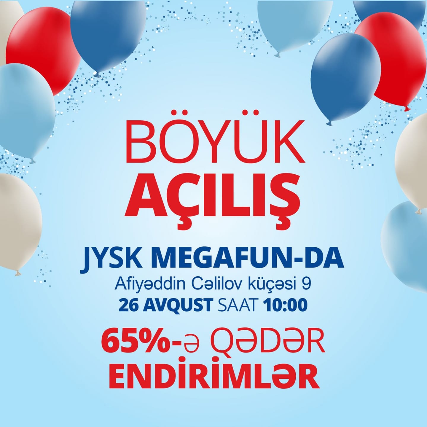 Marja xəbər verir ki, 26 avqustda Megafun Əyləncə və İstirahət Mərkəzində JYSK mağazasının açılışı nəzərdə tutulur. Açılış münasibətilə ev, bağ və ofis mebelləri ve dekor elementləri 65%-dək endirimlə təklif olunacaq.
