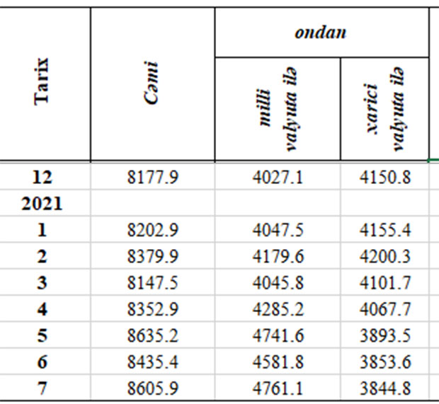 Marja Mərkəzi Banka istinadən xəbər verir ki, 2021-ci ilin iyun ayının sonu ilə müqayisədə iyul ayında milli valyutada olan əmanətlər 179,3 milyon manat artaraq 4 milyard 761,1 milyon manata yüksəlib. Xarici valyutadakı əmanətlər isə 8,8 milyon manat azalaraq 3 milyard 844.8 milyon manata geriləyib.