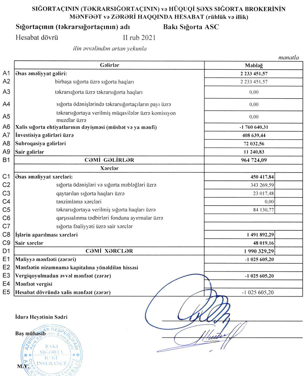 "Bakı Sığorta" ASC 2021-ci ilin 1-ci yarısını (yanvar-iyun dövrünü) 1 milyon 25 min manat xalis zərər ilə başa vurub. Zərər sığorta ehtiyatının yaradılması ilə əlaqədardır. "Bakı Sığorta" 2020-ci ili 155 min manat xalis mənfəət ilə bağlamışdı.