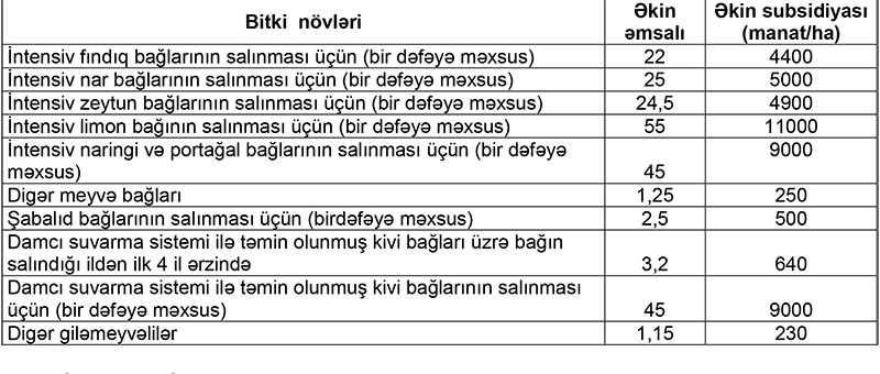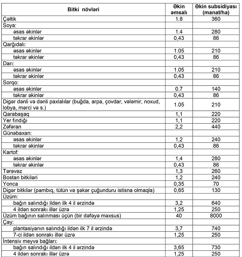Marja.az xəbər verir ki, qərara əsasən, baza məbləği 200 manat olmaqla 2022-ci ildə əkin əmsalları və əkin subsidiyasının məbləği kənd təsərrüfatı bitkiləri üzrə aşağıdakı kimi müəyyən olunub: