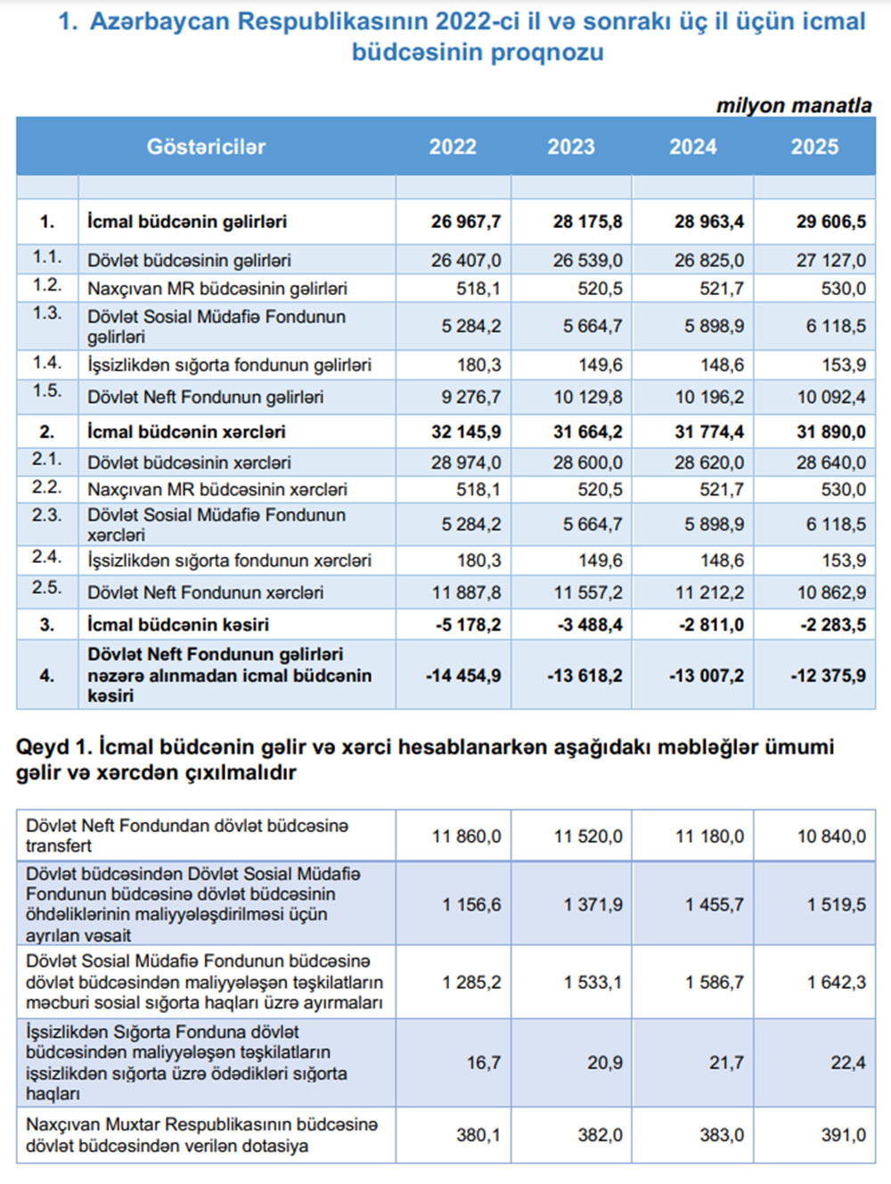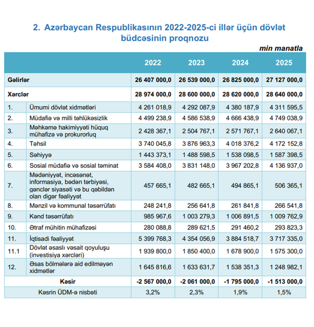 2022-ci ildə icmal büdcənin gəlirləri 26 milyard 967,7 milyon manat, xərcləri 32 milyard 145,9 milyon manat, kəsiri isə 5 milyard 178,2 milyon manat səviyyəsində proqnozlaşdırılır.